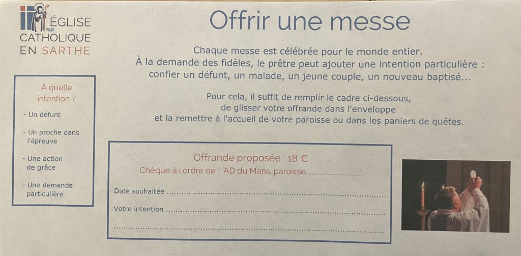 Pour faire célébrer une messe à une intention, il suffit d’appeler au presbytère pour convenir de la date. L’offrande pourra être remise dans une enveloppe comme ci-dessus.